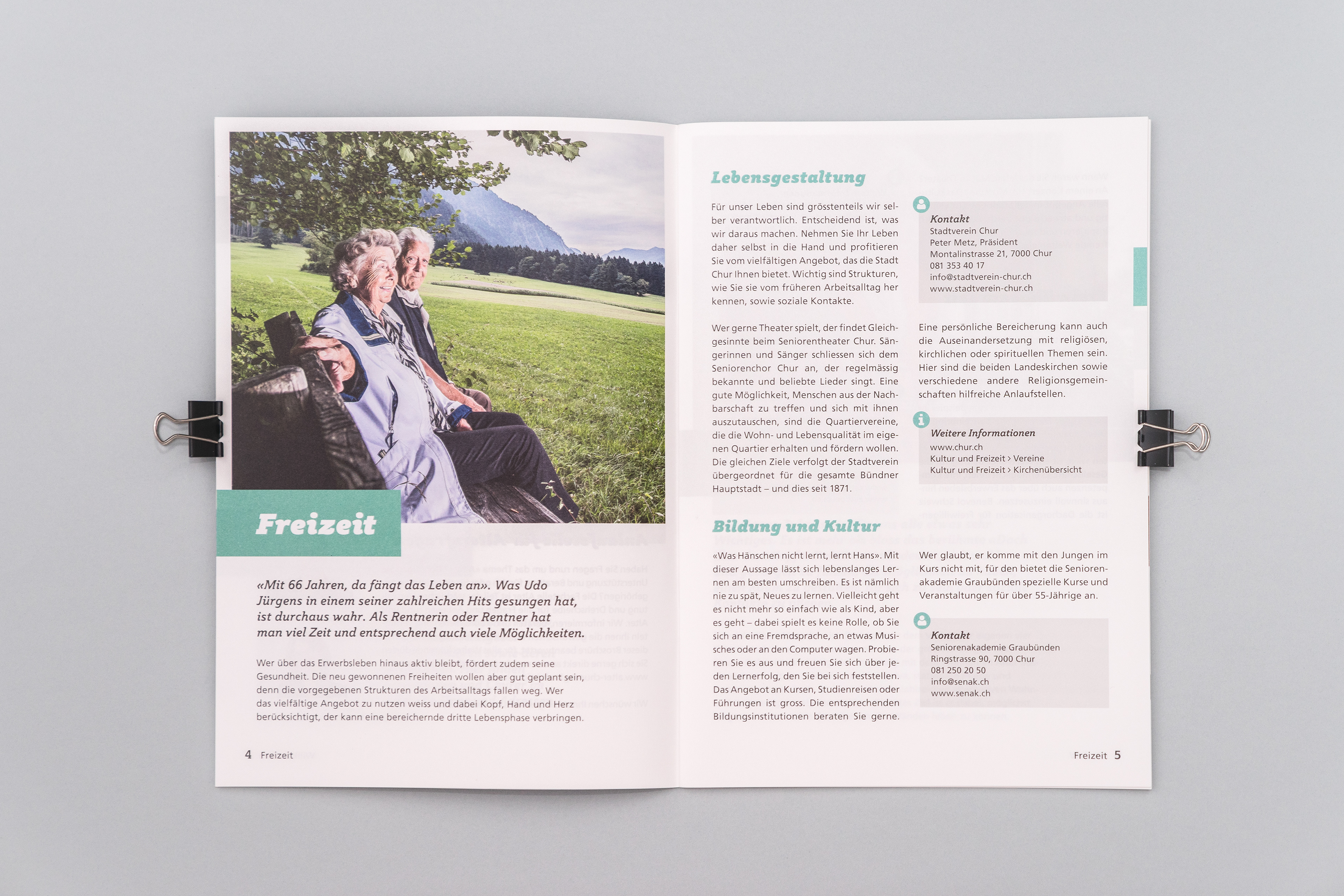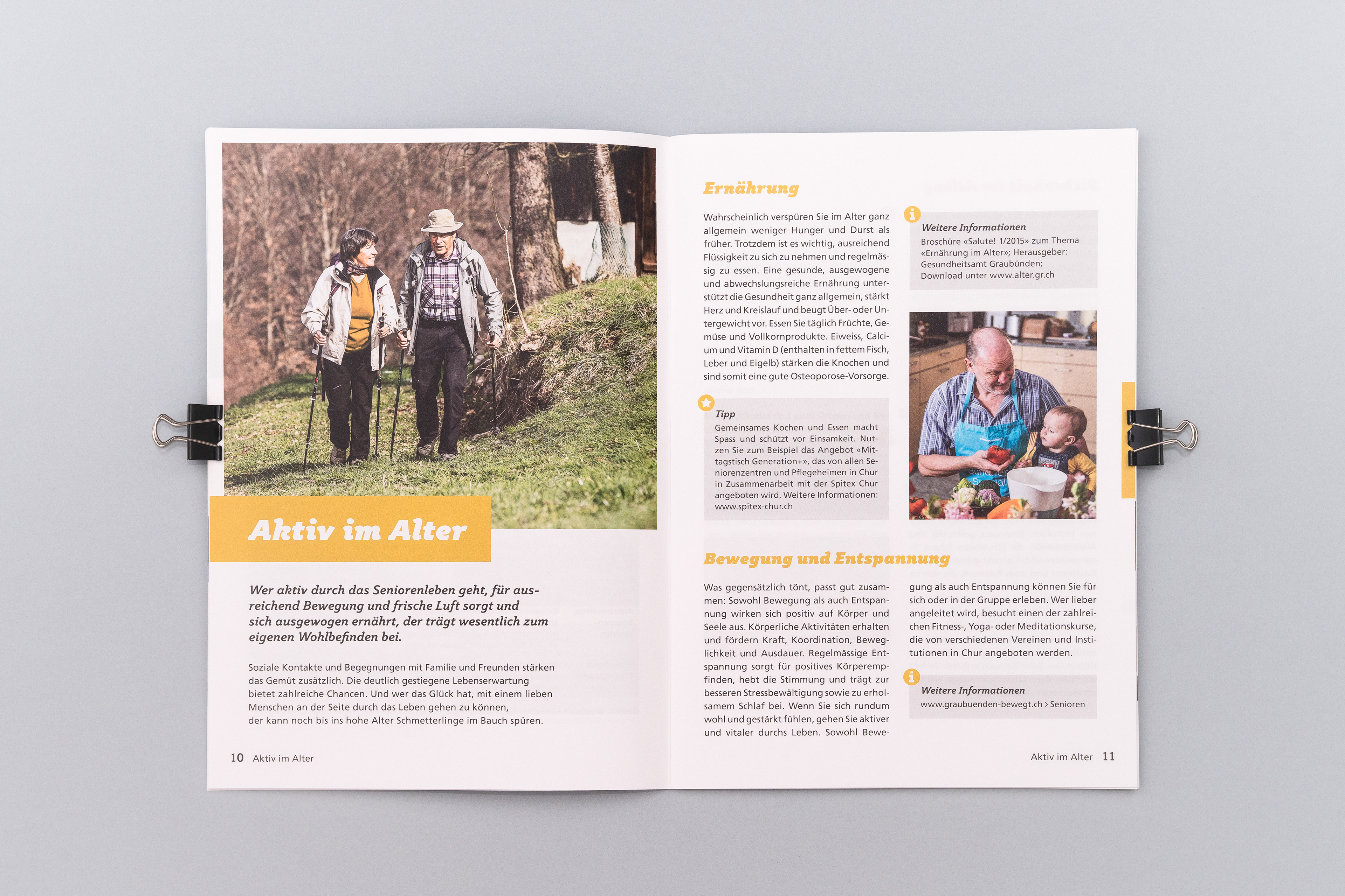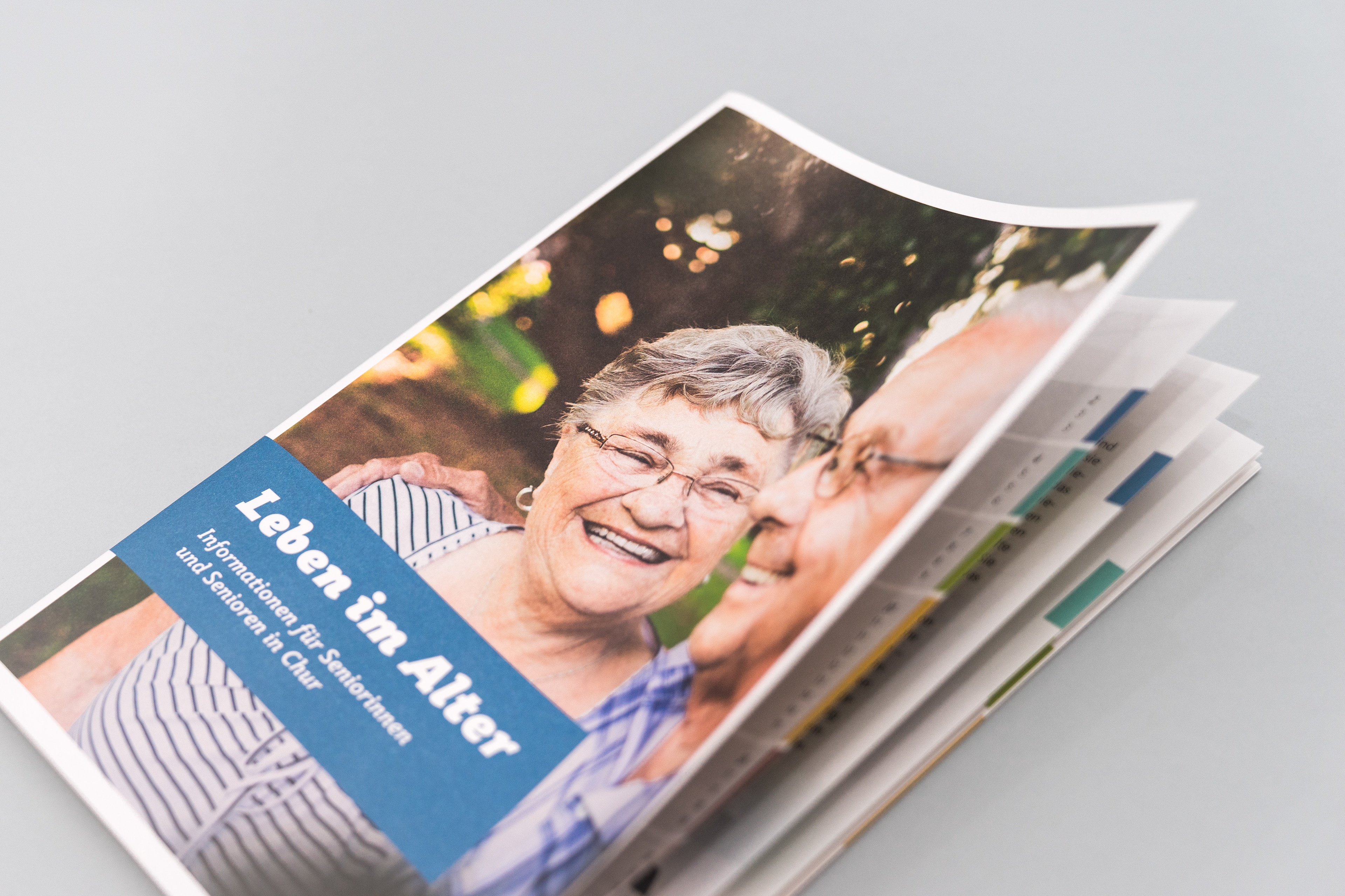 Die Broschüre «Leben im Alter» der Fachstelle Alter und Gesundheit Chur dient als Ratgeber für Seniorinnen und Senioren. Für die erste Auflage entwickelte ich Layout- und Farbkonzept, die als Grundlage für alle Inhalte dienten. Im Fokus standen Lesefreundlichkeit und Übersichtlichkeit, ergänzt durch Kontaktstellen, Tipps und weiterführende Informationen zu jedem Thema.