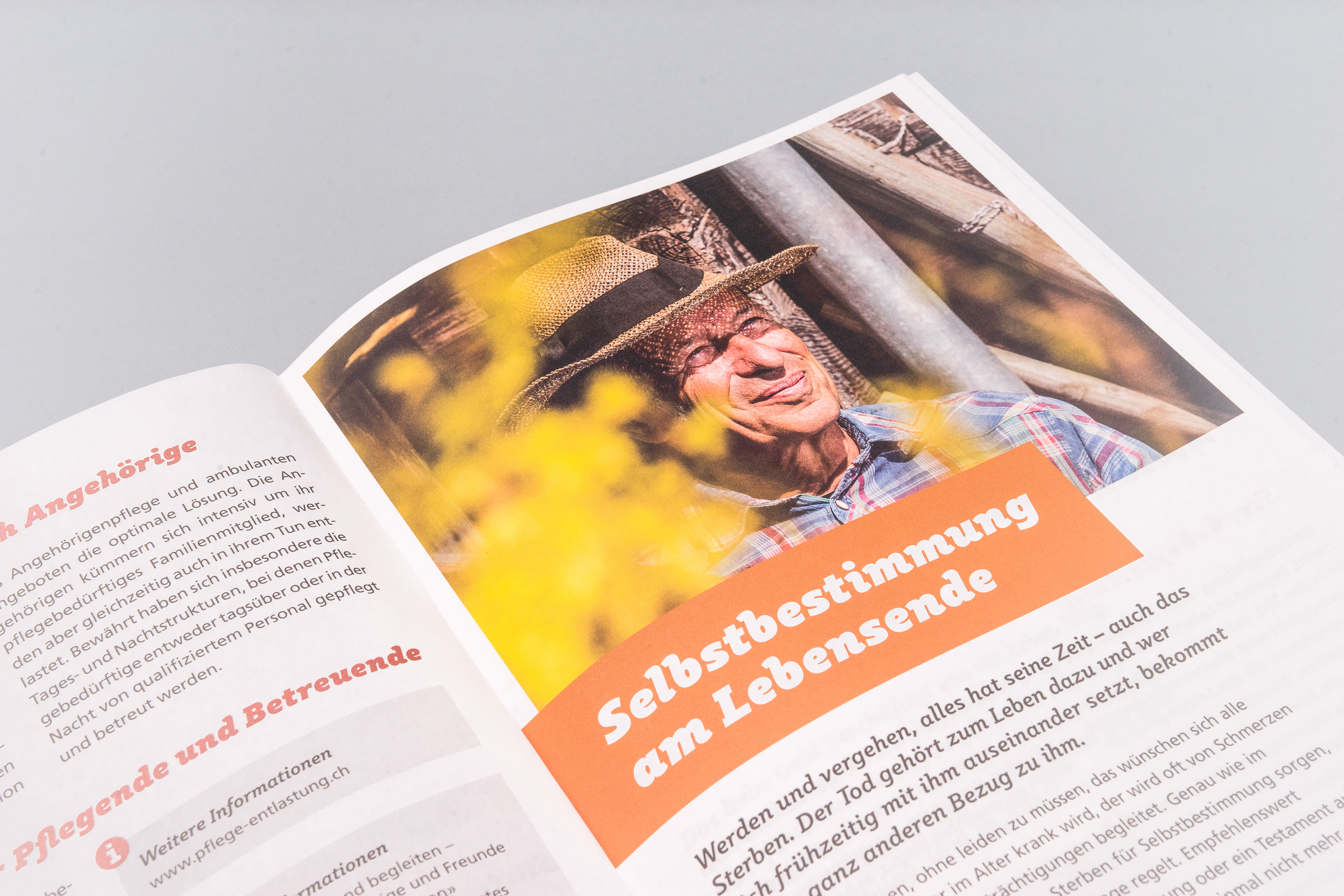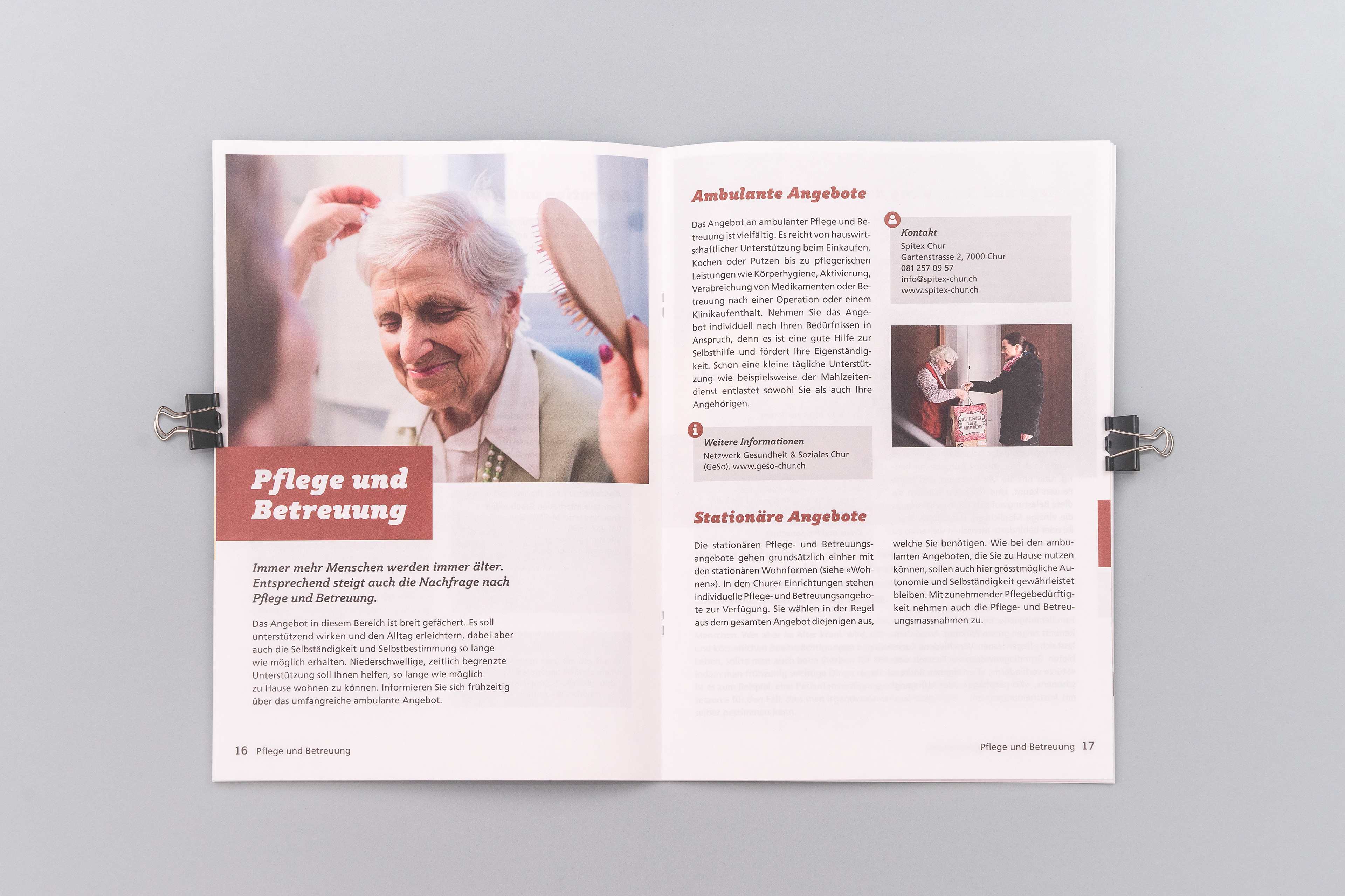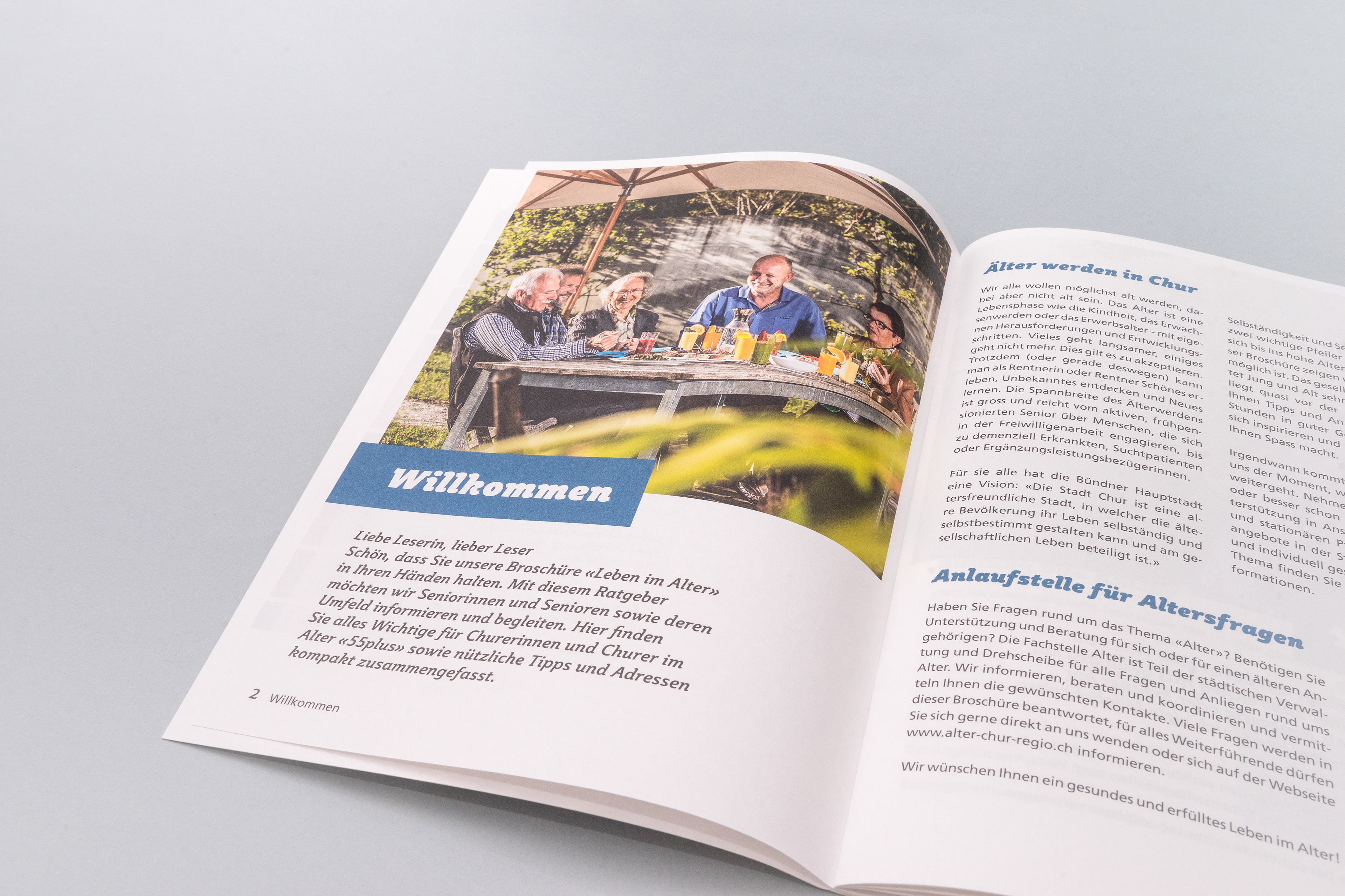 Die Broschüre «Leben im Alter» der Fachstelle Alter und Gesundheit Chur dient als Ratgeber für Seniorinnen und Senioren. Für die erste Auflage entwickelte ich Layout- und Farbkonzept, die als Grundlage für alle Inhalte dienten. Im Fokus standen Lesefreundlichkeit und Übersichtlichkeit, ergänzt durch Kontaktstellen, Tipps und weiterführende Informationen zu jedem Thema.