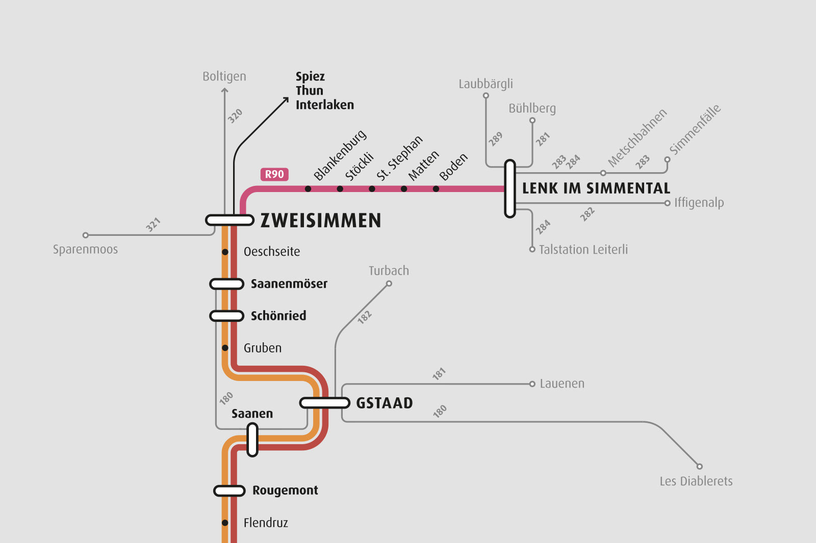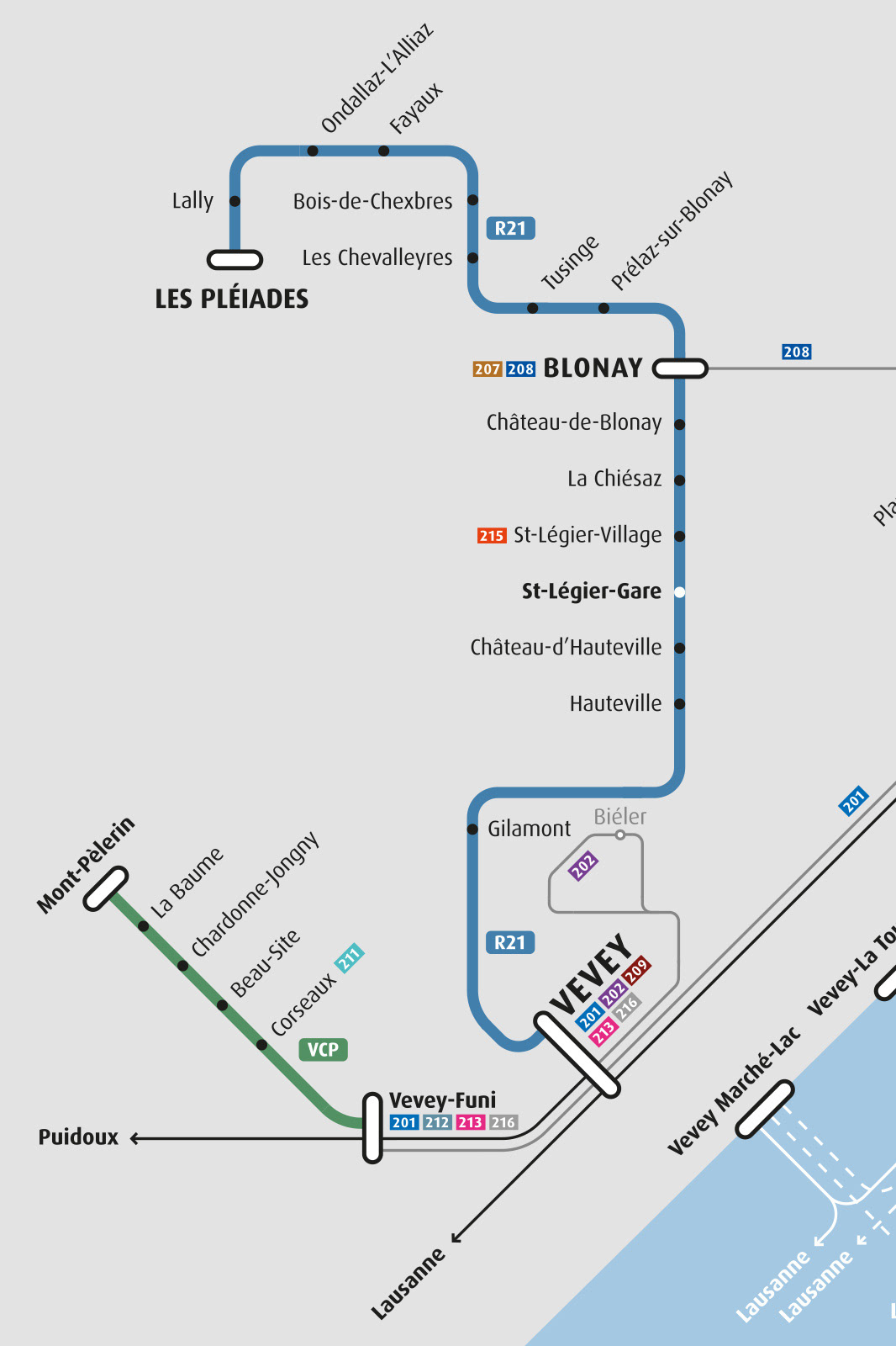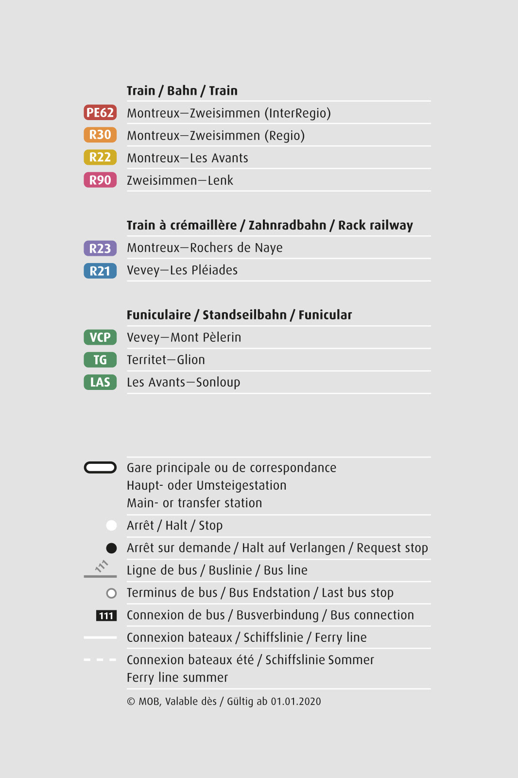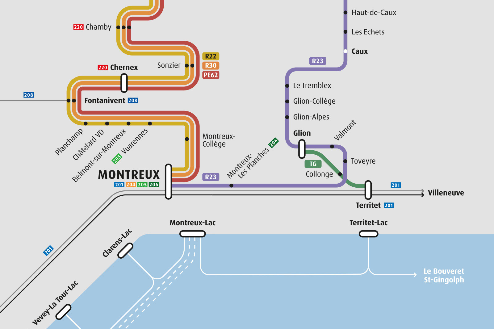 Für die Montreux-Oberland-Bahn (MOB) gestaltete ich einen übersichtlichen Linienplan, der alle Bahnlinien bis ins Berner Oberland darstellt. Die Informationshierarchie ist klar strukturiert, Farben und Formen harmonisch aufeinander abgestimmt. Der Plan wird seither an allen Haltestellen in Plakatform aufgehängt und bietet so Orientierung, Übersicht und ästhetische Klarheit.