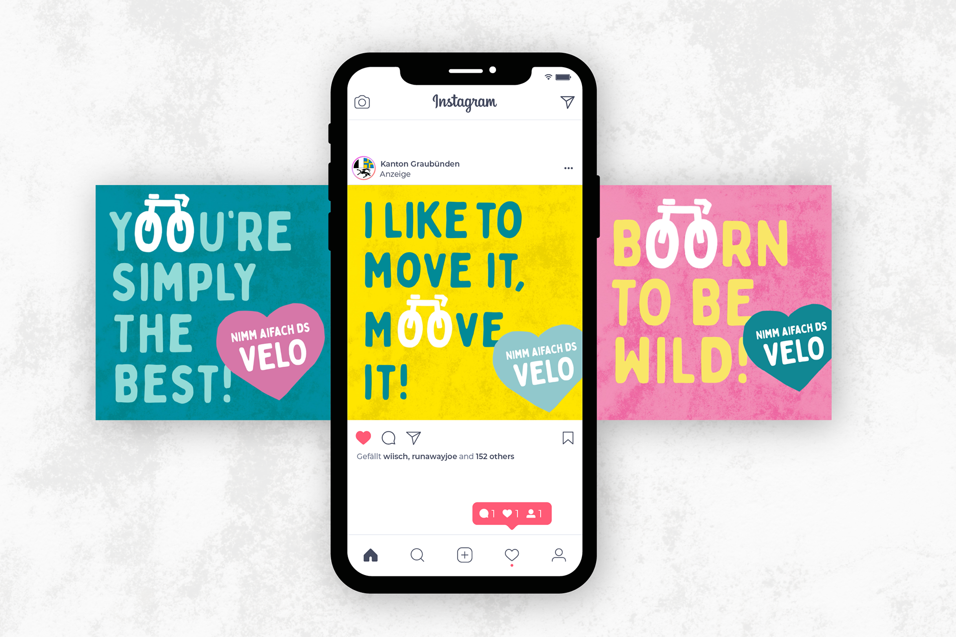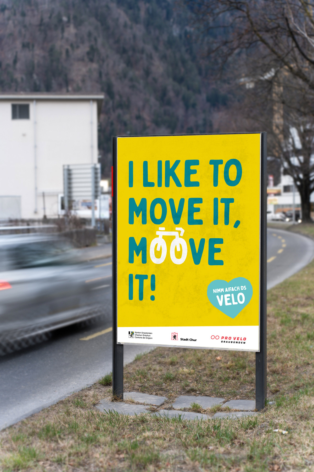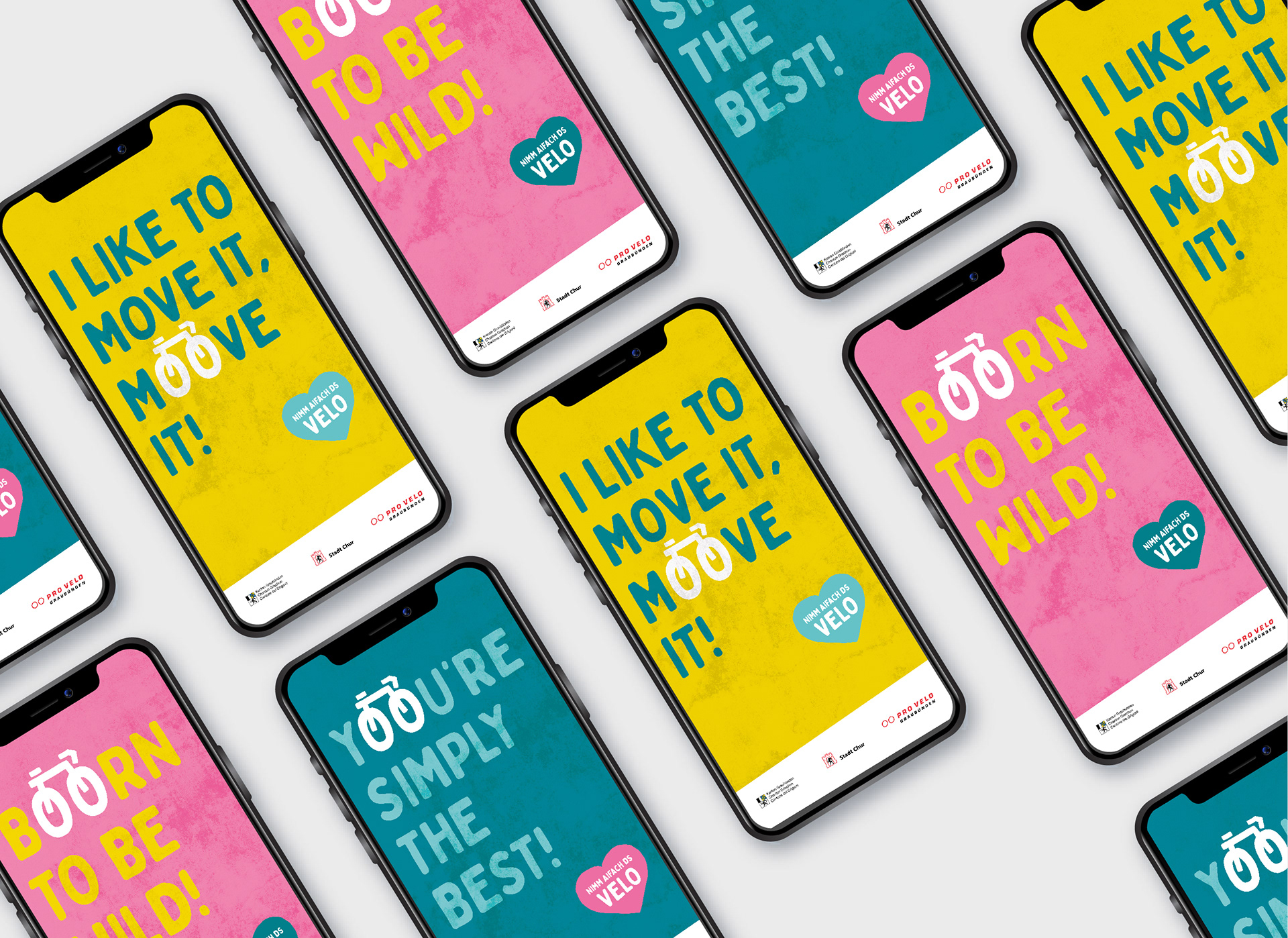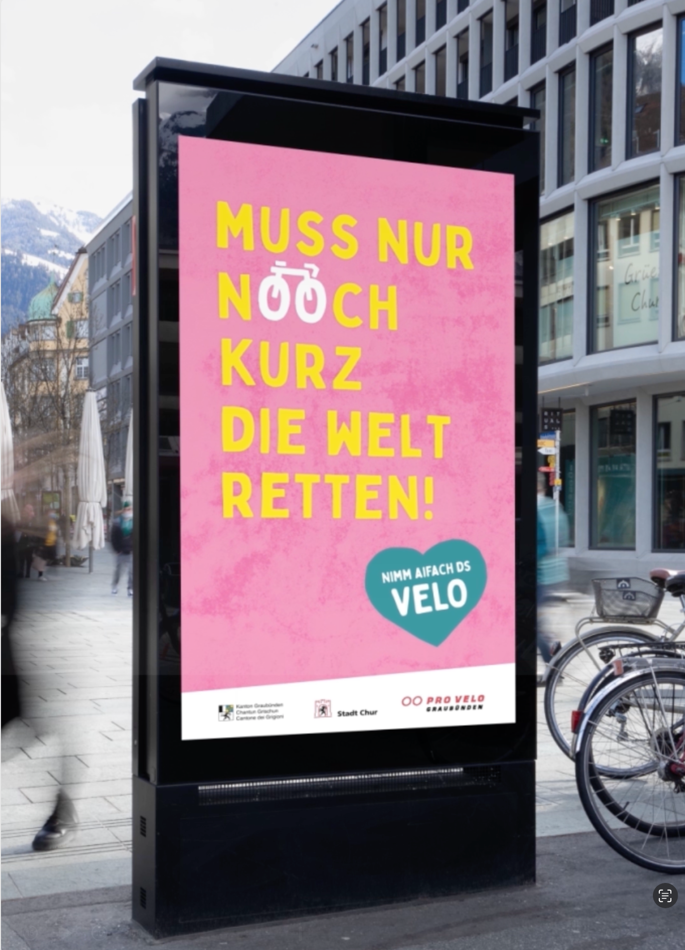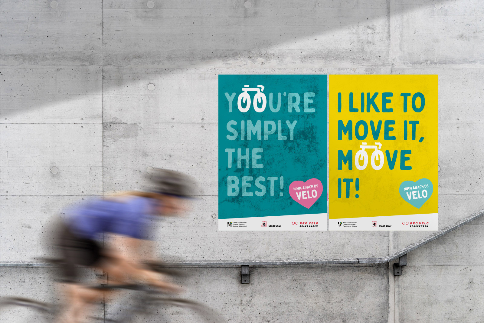 Von 2022 bis 2024 war in der Region Chur die kantonale Velokampagne mit ihren eingängigen Ohrwürmern zu sehen – ob auf Plakaten oder online. Ich durfte die Kampagne während drei Jahren konzipieren und visualisieren. Sie soll mit Witz und Leichtigkeit zum Velofahren animieren und wurde vom Tiefbauamt Graubünden mit Pro Velo und der Stadt Chur lanciert.