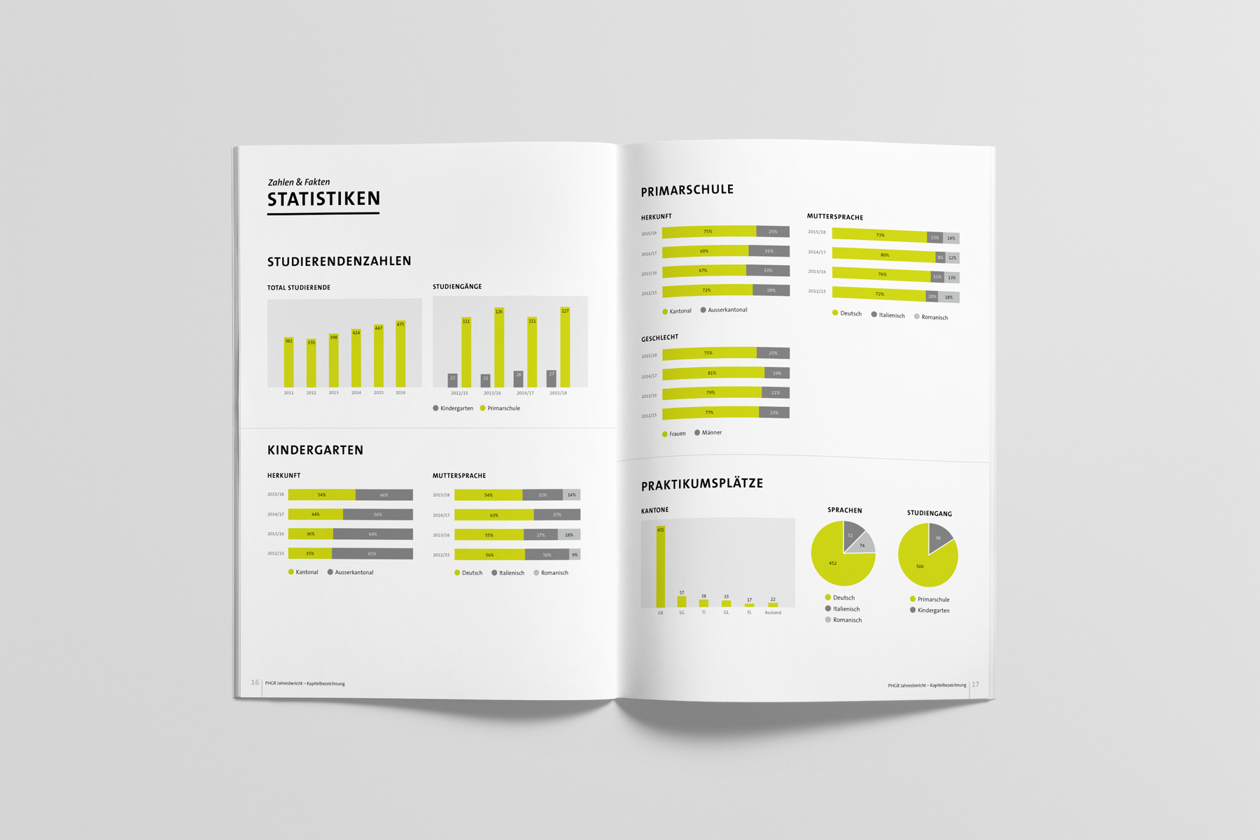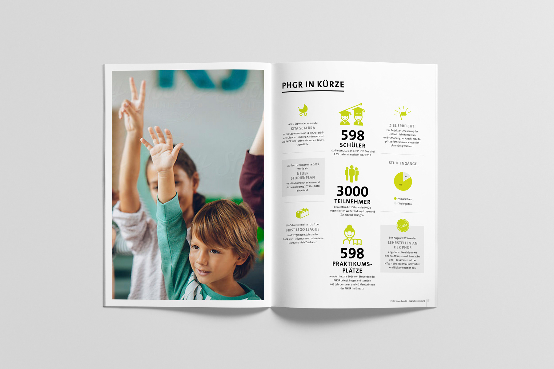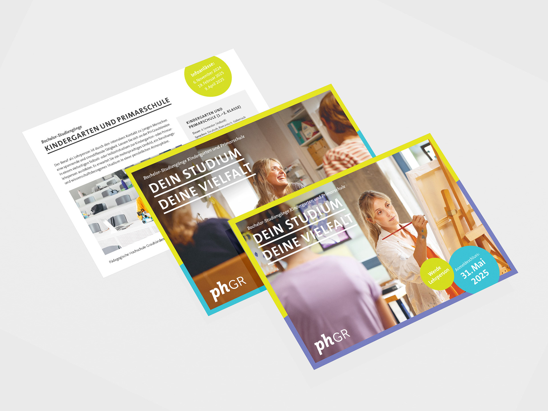 Im Jahr 2016 suchte die Pädagogische Hochschule Graubünden einen neuen Ansatz für ihren Jahresbericht – meine moderne Neuinterpretation überzeugte. In den folgenden Jahren wurde das Erscheinungsbild stetig verfeinert: Das Logo erhielt ein Redesign, das Corporate Design wurde aktualisiert und auf alle Medien angewendet. Auch die Bachelor- und Masterkampagnen entwickelten sich gestalterisch laufend weiter und zeigen heute einen frischen, zeitgemässen Auftritt.