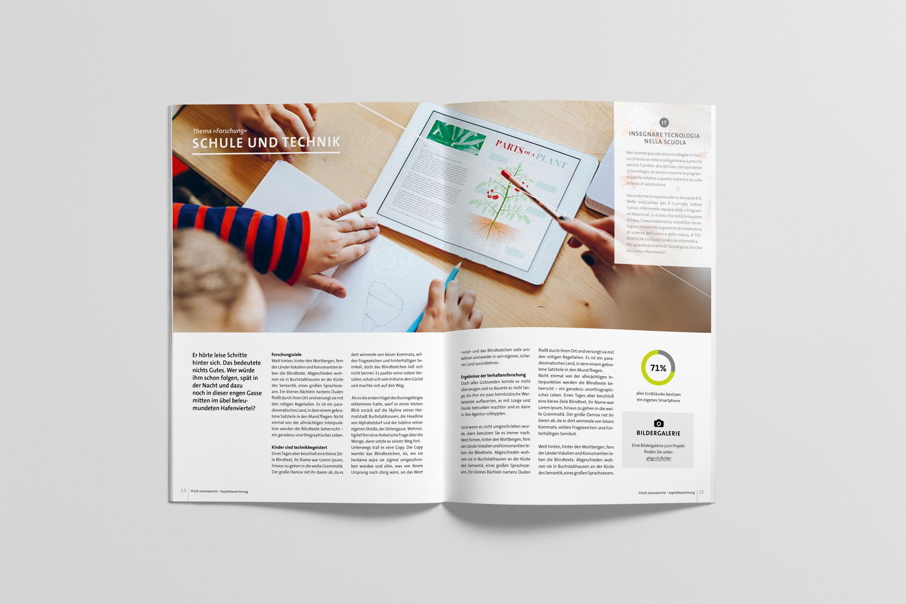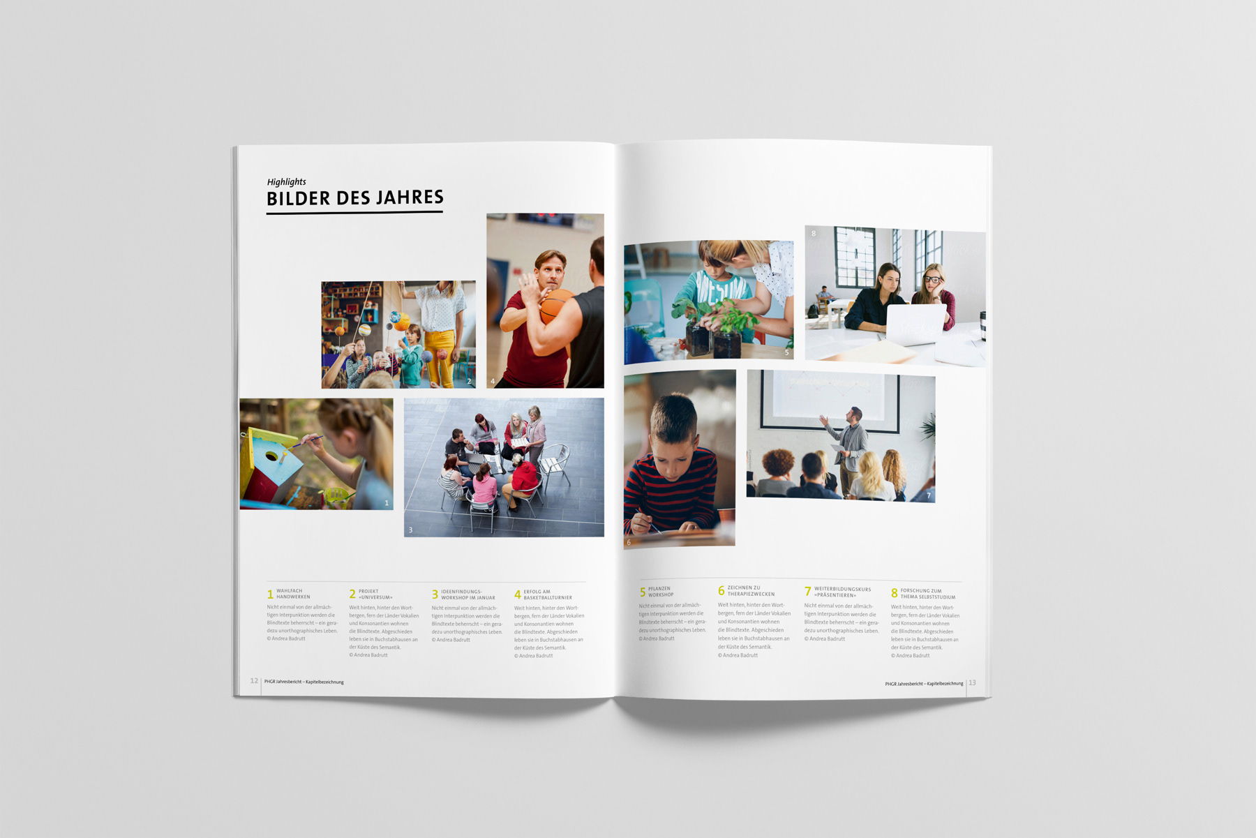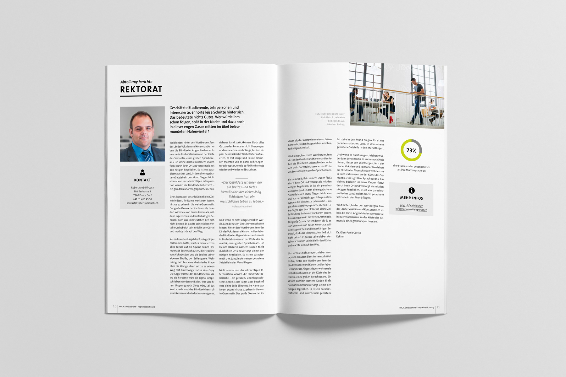 Im Jahr 2016 suchte die Pädagogische Hochschule Graubünden einen neuen Ansatz für ihren Jahresbericht – meine moderne Neuinterpretation überzeugte. In den folgenden Jahren wurde das Erscheinungsbild stetig verfeinert: Das Logo erhielt ein Redesign, das Corporate Design wurde aktualisiert und auf alle Medien angewendet. Auch die Bachelor- und Masterkampagnen entwickelten sich gestalterisch laufend weiter und zeigen heute einen frischen, zeitgemässen Auftritt.