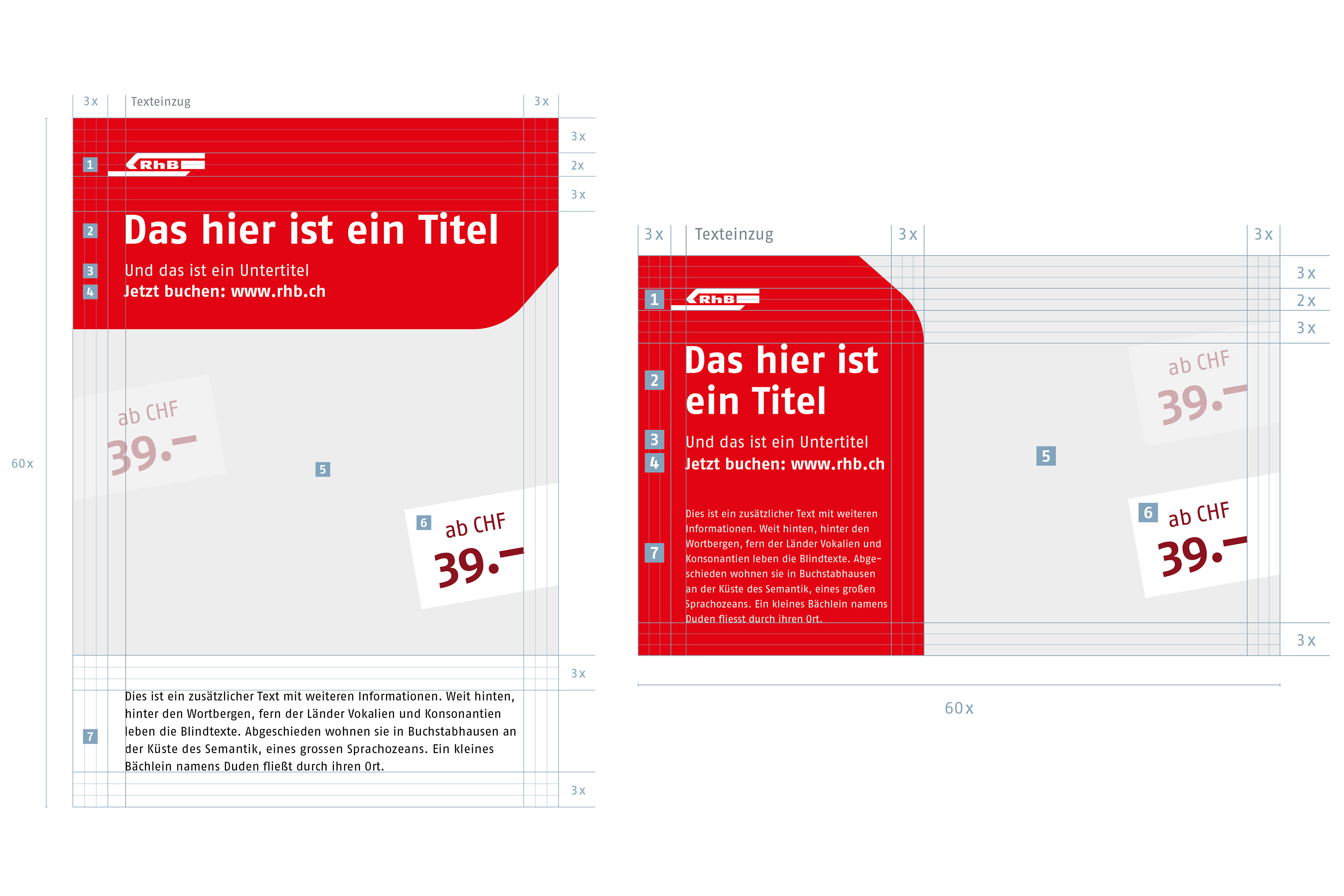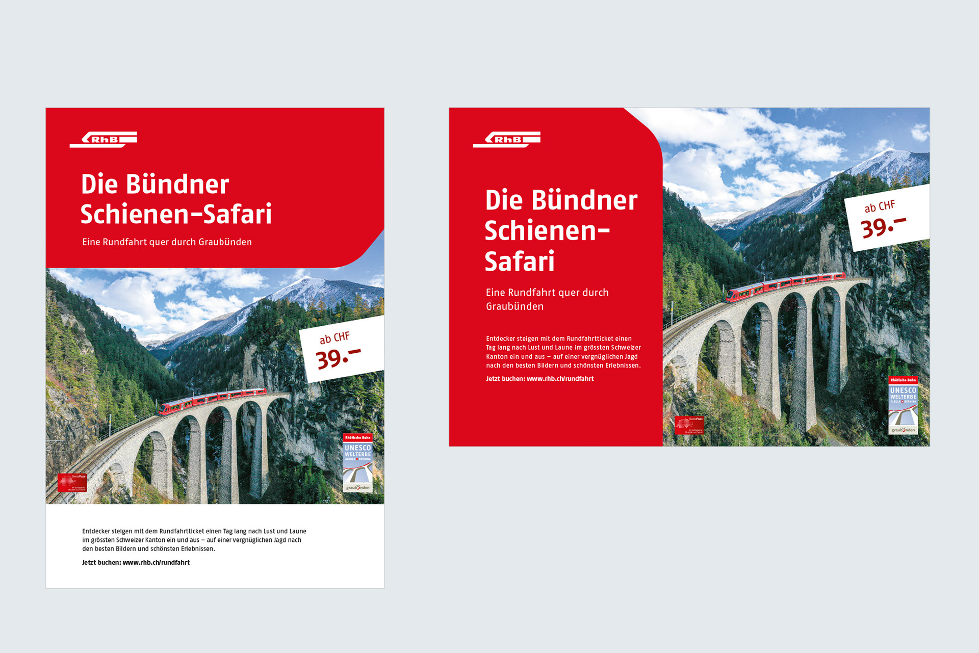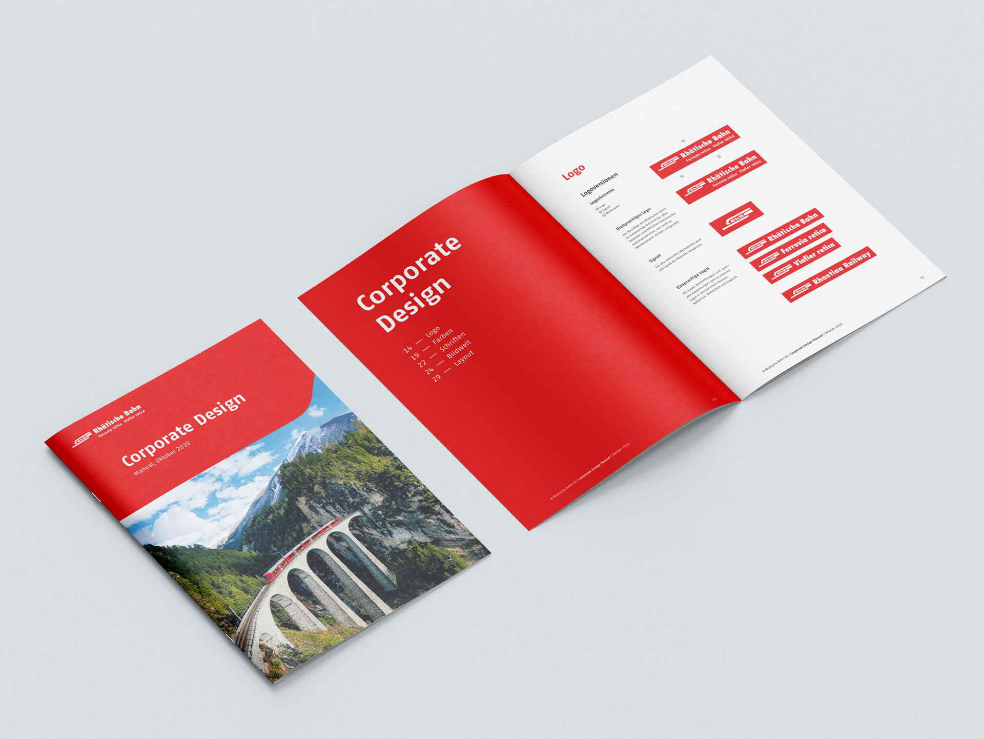 Für die Rhätische Bahn durfte ich das bestehende Corporate Design weiterentwickeln und modernisieren. Das bewährte Erscheinungsbild wurde vereinfacht und verfeinert, ohne seinen Wiedererkennungswert zu verlieren. Im Rahmen des Projekts erarbeitete ich das Design-Manual und entwickelte ein flexibles Gestaltungsraster, das als Grundlage für alle künftigen Anwendungen dient.